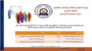يعلن مركز التعليم المستمر في جامعة المثنى عن انطلاق دورات الكفاءة للفترة من 5-9اذار 2023 وفق الجدول ادناه فعلى الراغبين بالتسجيل مراجعة مركز التعليم لمستمر مع […]
