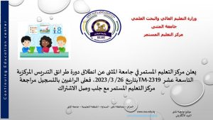 يعلن مركز التعليم المستمر في جامعة المثنى عن انطلاق دورة طرائق التدريس التاسعة عشر (TM-2319) بتاريخ 26-3-2023 فعلى الراغبين بالتسجيل مراجعة مركو التعليم لمستمر مع جلب […]