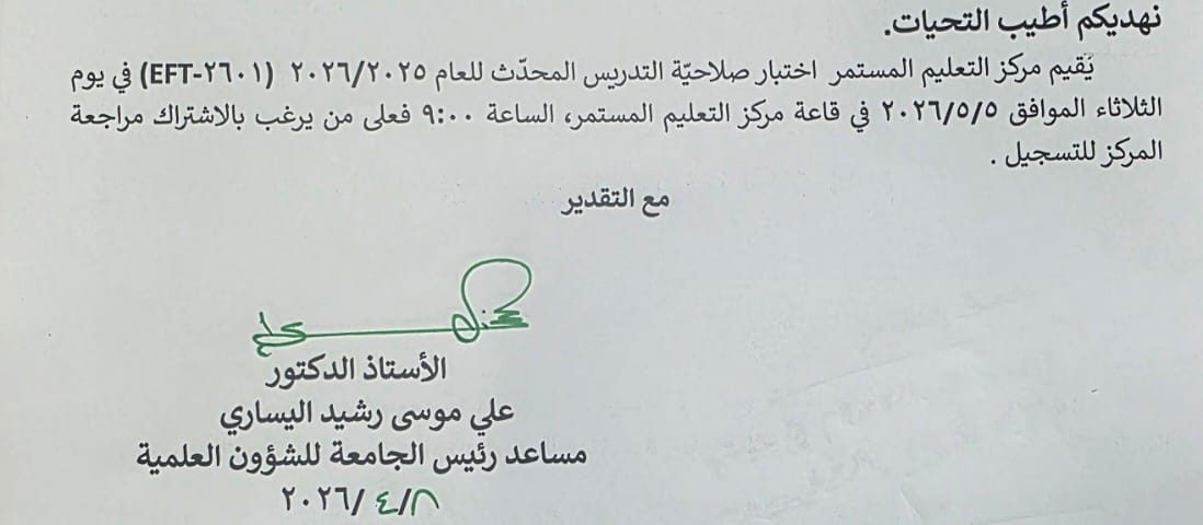 تعلن جامعة المثنى / مركز التعليم المستمر عن إقامة اختبار صلاحية التدريس المحدث (EFT-2601) للعام الدراسي 2025/2026.
