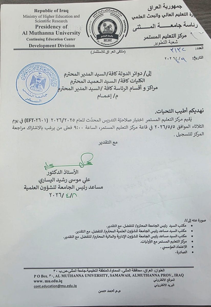 2026-04-12ببالغ السرور والاعتزاز، يتقدم كادر مركز التعليم المستمر في جامعة المثنى بأسمى آيات التهاني والتبريكات إلى السيد مدير المركز (الدكتور نبيل عبد الله غياض المحترم) بمناسبة نيله مرتبة (أستاذ مساعد).